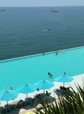 Features stunning skyline pools and cliffside swimming spots. The private beach with fine sand offers an instant vacation vibe.