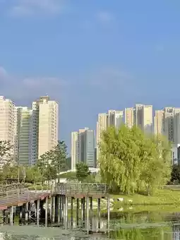 There is a lake in the middle of the park, and there is a fountain show at night.
