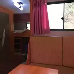 The inside of the caravan has a bed on one side and a two-story bed on the other side, and there is a table and a sofa kitchen in the center. There is also a TV! There is also a bathroom where you can shower inside, so it was very convenient to use.