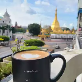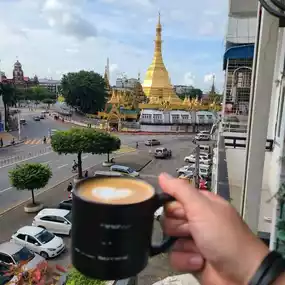 Coffeeshop with an exception view of Sule Pagoda.  It's hard to find. Look for a small blackboard.