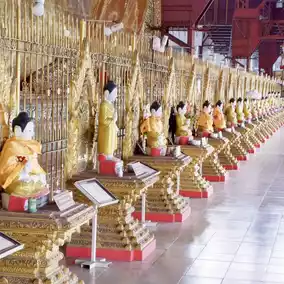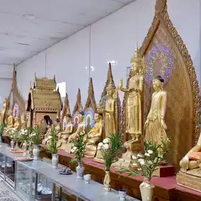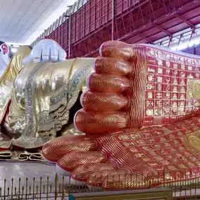 Chaukhtatgyi Buddha Temple, also known to Thais as 'Phra Ta Wan,' is located in Yangon. It features the largest reclining Buddha statue, measuring 65 meters in length! The face of the Buddha is exquisitely detailed and adorned with gems, making it incredibly captivating.