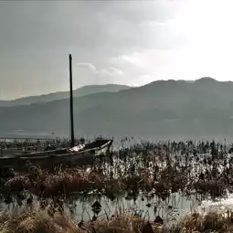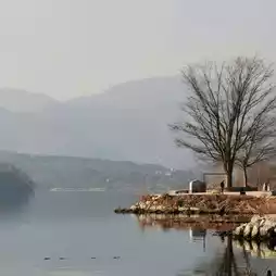 The boats and trees floating on the riverside are reflected on the water's surface, creating a beautiful sight.