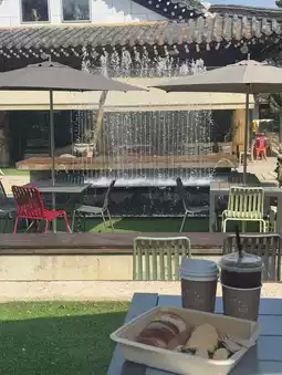 The site was bigger than I thought~ The distance between tables was also wide~ Drinking coffee and looking at the fountain was healing itself😍