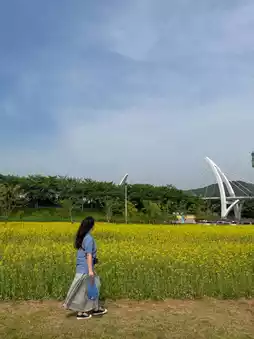 Hwangsan Park, located in Mulgeum-eup, Yangsan-si, Gyeongnam, is a massive riverside park spanning an impressive 760,000 pyeong. Situated along the Nakdong River, the park features well-maintained bike paths and a camping site, making it a popular destination for outings. It's a great spot to enjoy different seasonal flowers and have a picnic. Currently, you can admire the blooming canola flowers. Additionally, there's a dog exercise area, making it an excellent place for pet owners to visit!