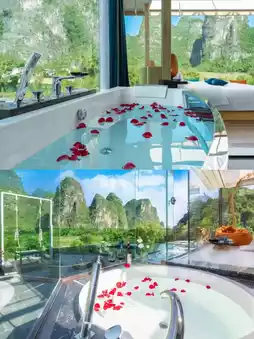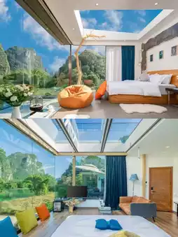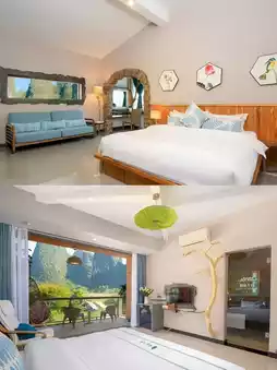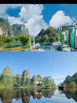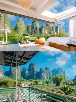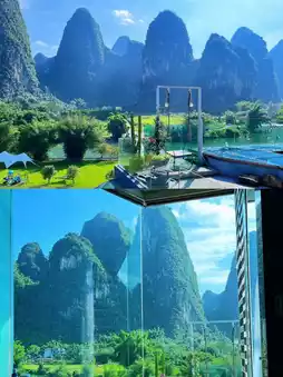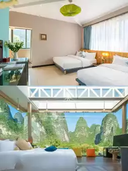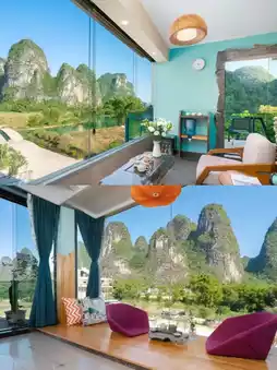 The Yu Long Zuo An Hotel in Yangshuo is located downstream of the Yulong River, and I just happened to pass by it on my way from Shui E Di to Wan Jing. Initially, I was attracted by its geographical location, but later, when selecting the room type, I hopelessly fell in love with the Mountain and Starry Sky Suite. This room type boldly occupies the entire top floor, the 5th floor, with a luxury suite + starry sky top + private terrace and soaking pool + private swing + private garden restaurant + panoramic circular bathtub. Tell me, which girl could resist this combination? At least I couldn't, and I booked it. It turned out my choice was correct, and my friends also had nothing but praise for this homestay!