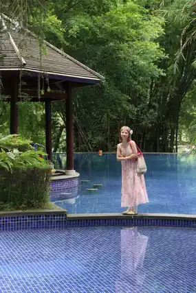 Big swimming pool 🌊, small pavilion 🛖, and a walking path along the Yulong River