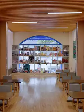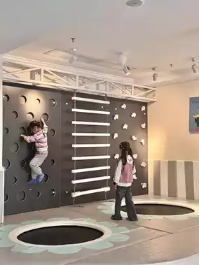 🫧 The lobby has a large play area for kids, with things kids love to play with: a doll wall (claw machine, capsule machine), a block wall, a spiral slide, a trampoline, and a wooden sandpit.
