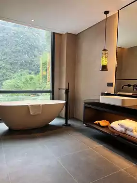 The hotel's infinity pool is directly connected to the mountains, and taking pictures is like falling into a landscape painting 🏞️! There is also a large original ecological lawn, a water park➕a parent-child park, where you can have fun with your baby 👶🏻! The room is also equipped with a bathtub 🛁, where you can take a bath while watching the karst peaks. It's so comfortable that you don't want to go out!!