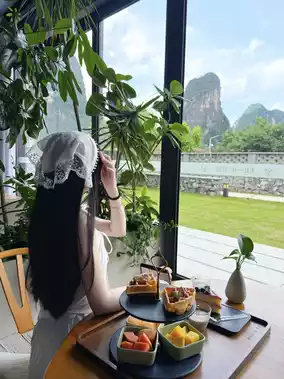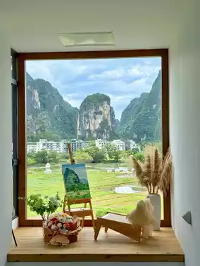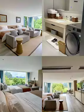 The moment I checked into this mountain-view room in Yangshuo, I was speechless by the beauty of this floor-to-ceiling window 😠With afternoon sunlight streaming in, sitting on the rocking chair while enjoying fruits and tea—pure bliss bubbling up! (The first thing upon arrival was receiving a welcome fruit platter) So thoughtful, I could love this hotel forever!