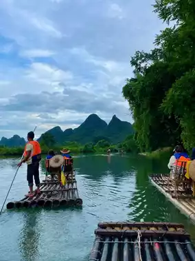 Bamboo rafting in Yangshuo is a peaceful and scenic ride down the river on a traditional-style bamboo raft, often powered by a local boatman using a long pole.