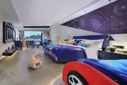 👶 Fantasy Bathtub Family Room: The sheets are printed with cartoon rockets, and even the pillows are star-shaped! The 1.8-meter bed is big enough for a family of three, and there's a crib next door, so the kids won't have to fall out even if they toss and turn in the middle of the night.