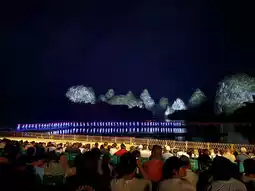 Snag a shot of the glowing river with the karst mountains in the background before the show starts. During the performance, try to capture the wide view for the breathtaking choreography against the mountain silhouettes.