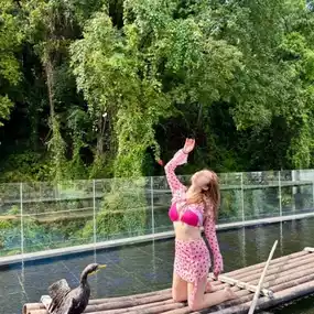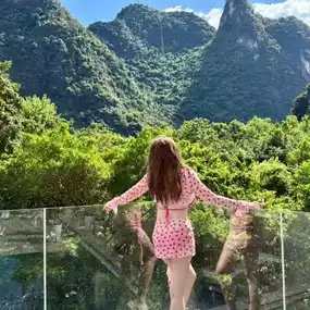 But the true highlight lies outdoors. Glide across the water on a bamboo raft, accompanied by cormorants, as if stepping right into the scene from the 20-yuan note. Stand on the glass platform, where the karst peaks unfold before your eyes, and the reflections of blue skies and green trees compose a living canvas. Slip into a bright-colored swimsuit, and you’ll capture stunning, “immersed-in-the-painting” photos in an instant.