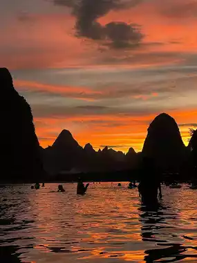 Highly recommend starting early in the morning when the Li River is tranquil, and all you can hear is the sound of the bamboo raft gliding through the water. The bamboo rafting experience on the Li River takes about an hour, offering breathtaking views of Nine Horse Fresco Hill and the scenery depicted on the 20 RMB note. It feels like floating on a giant ink painting. The bamboo raft ride is very comfortable and not bumpy. It's advisable to book tickets in advance (ticket price: 90 RMB). During peak seasons, arrive early to avoid crowds, so your photos can feature the pure backdrop of green mountains, clear waters, and distant fishing boats.