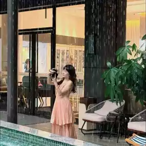 The pool area is a hidden gem for Instagram-worthy shots! With water curtains gently flowing, you can lounge on blue-and-white chairs or frame the perfect shot by the water. Tropical plants dot the space, making it feel like you’ve stepped into a lush tropical resort. And don’t miss the floral wall that says, "I knew you’d come, so I waited—Yangshuo." Adorned with pink blossoms, it’s both artistic and romantic—snap a picture here, and you’ll look like a dreamy goddess.