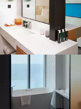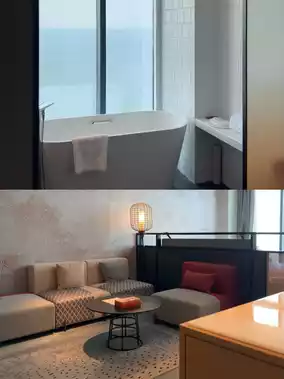 Featuring a freestanding bathtub🛀, minibar, and floor-to-ceiling windows🪟 with ocean views🌊—I'm obsessed😊