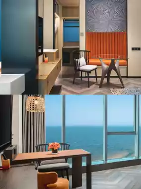 🍽️The hotel has only one Neighborhood Café, but its ocean-view🌊 setting on the first floor blends modern retro with marine-themed decor—absolutely lovely👍.