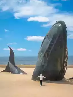 A giant whale statue stands solemnly by the shore, its steel body contrasting with the gentle waves. Every photo with it tells a story.