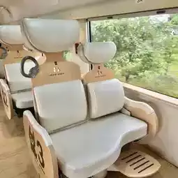 The interior of the Aso Boy is very spacious and comfortable, with a variety of different seats and facilities. The first carriage has a panoramic window with sofa seats and a dining table at the back, making it suitable for families or couples. The second carriage is the white bear carriage, which has a black coffee shop, white bear seats for parents and children, a wooden game pool and a reading space😆