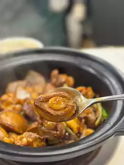 Zesty Abalone and Chicken Casserole: Baked in a high-temperature casserole, it has a fragrant aroma and rich flavor. Abalone has a chewy texture with a sweet taste of the ocean, and becomes even crispier after being cooked at high temperature. The marinated chicken pieces are tender and juicy, absorbing the salty flavor of the sauce.