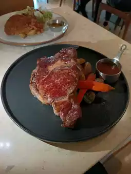The beef burger is quite substantial, with a charred and chewy texture, served with crispy and tasty fries.