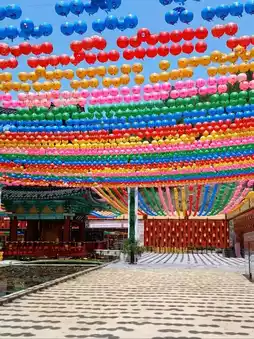 The vibrant sculptures and lanterns behind the Buddha statues create an atmosphere reminiscent of a Buddhist art exhibition. True to the spirit of Buddha's Birthday, the temple hosts various events, and the cheerful expressions of visitors bring life to the entire place. It's a day filled with warmth and joy in a lively and special ambiance.