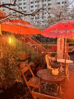 오랑제뜨22 is like walking into an orange-hued autumn dream. The café’s theme pops — everything feels warm and vibrant. Their outdoor section is the real star: tons of tables, chairs, and parasols beneath cherry blossom trees. At night, it transforms into a cozy, romantic hangout you’ll want to linger at with friends or a date.