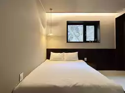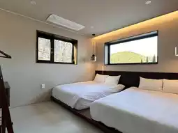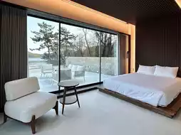 There is a folding door in the middle of the living room that leads to the outdoors, and outdoors, there is a beautiful fire pit space with a mix of Egyptian and European sensibilities, an outdoor hot spring pool, and an outdoor terrace space where you can sit and talk. When you come back into the living room, you can use one bathroom with two sinks, a toilet, and a shower room, one bedroom (one bathroom with a bathtub and toilet) that can be entered through the hidden door, which is the current interior trend, and one main bedroom (with a shower, toilet, and sink) with a beautiful view through the large window.