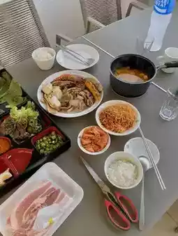 To be honest, I don't recommend the BBQ set. It's 80,000 won for 2 people, but it's 40,000 won for 1 person, and it's good because they provide small portions of basic side dishes, rice, soup, sausages, etc. so you don't have to bring them all, and you don't have to buy everything new when you go shopping, so it was really good, but the most important part, the pork neck, was so tough that it didn't taste goodㅠㅠ We ate the pork belly that we bought separately....😅