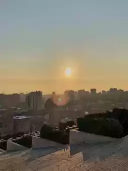 Climbing the hill to the top, you're greeted with a panoramic view of downtown Yerevan. The mountain faintly visible in the distance