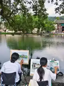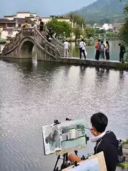 📍The first spot after entering Hongcun’s main gate is this curved lakeside. The arch bridge and Huizhou-style buildings shrouded in morning mist are full of charm. Be sure to capture the reflections when the lake is like a mirror! Art students often set up their easels here to sketch~