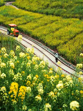 The rapeseed flowers are blooming all over the hillside, and the scene of the small train passing through it, and the big Ferris wheel behind it makes people feel like they are in the scenes of anime
