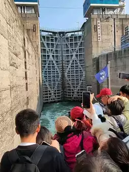 The lush green mountains and picturesque landscapes on both sides of the Yangtze River are truly breathtaking. Passing through layer upon layer of mountains, the morning was spent patiently waiting at Gezhouba Dam to experience the rising water levels and pass through the two ship locks. Since the ship is large and crowded with tourists, it's important to secure a spot at the bow early to get a close-up view of the water level changes and the thrilling moment when the gates open. In the afternoon, I visited the Three Gorges Dam to see the construction of the Yangtze River's water conservancy project. While the visit felt a bit rushed and less engaging, it confirmed the saying, "Not visiting the Three Gorges Dam is a regret, but seeing it might leave you disappointed." Nonetheless, the experience of passing through the ship locks at Gezhouba Dam was well worth the trip.