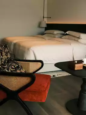 The moment you step inside, you'll be pleasantly surprised! The rustic wooden decor paired with warm lighting creates a cozy ambiance, and the floor-to-ceiling windows offer a view of the lively old town. The bedding is as soft as clouds, and even the mattress is made of latex, ensuring a stress-free sleep after a long day of travel. The private balcony, furnished with rattan chairs and a table, is perfect for enjoying a cup of tea in the morning or soaking up the sun in the evening, adding a homely warmth that hotels often lack.