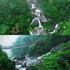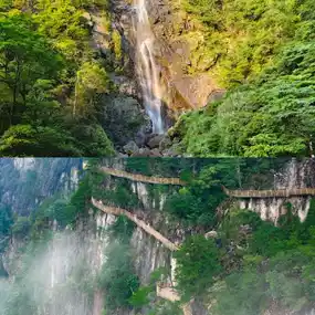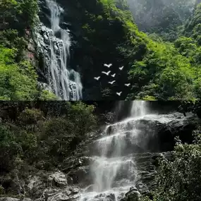 ✅ Yungu Waterfall: A standout among Mingyue Mountain's many waterfalls, it has an enormous volume of water after rain in spring and summer, creating an awe-inspiring sight. The huge flow cascading down the cliff forms a white water curtain, with splashing droplets like scattered pearls, shimmering with colorful light in the sunshine. Standing below the waterfall, feeling the mist and hearing the roar, you become one with nature.