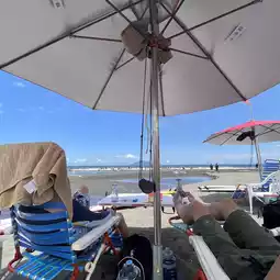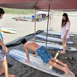 Surfboard rentals, surfing lessons, parasol seating areas, and lounge chairs are available