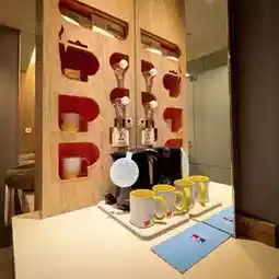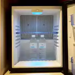 Then the small bar is placed with mineral water, coffee, tea bags, etc., and there is also a mini refrigerator for use.