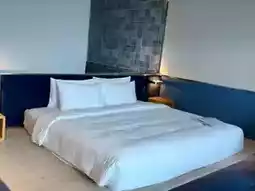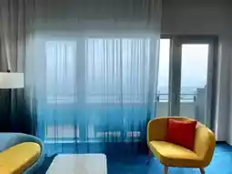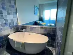 This Kaidu Plaza Hotel in Toucheng, Yilan, Taiwan, is designed with a cruise ship as the theme. This time, we will introduce the room features. Walking into the room, you will feel a sense of space. The color matching is all based on blue, gray, lake green, and yellow. It gives people a relaxed and comfortable feeling. And the details are done very well, such as the translucent gradient water and blue window screens. The natural light entering the room really makes you feel like you are living on a cruise ship. The bathroom design is also very exquisite. The tiles are like mosaics, and they are also matched with different levels of blue. And the room is equipped with a bathtub. The bathtub can also see the sea view outside the room. The sea view faces Wushi Lane, where you can see the sea and many people surfing. The overall feeling is quite free and easy. There is also a large beach chair, where guests can lie down and enjoy the scenery. #GlobalTravel