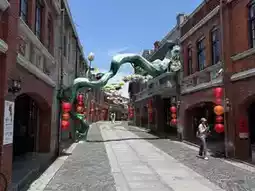 Walking into the reminiscent streets, the row of vintage red brick streets immediately reminded me of a movie set. Looking up, I saw lanterns swaying in the wind and giant dragon decorations. Around the corner, there was even a public art installation combining bamboo weaving and bright red floral fabrics—a traditional yet trendy experience!