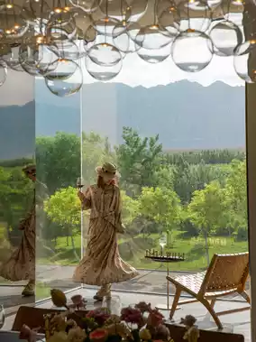 4️⃣The model standing on the stairs from the first to the second floor, with the vineyard in the background