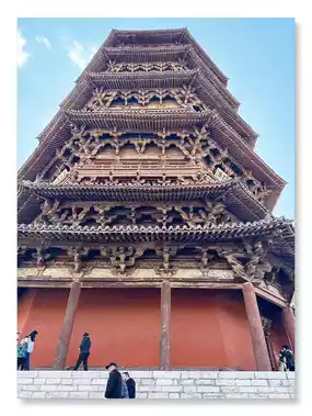 That day I came to Shanxi Province and visited the Yingxian Wooden Pagoda in Ying County, Shuozhou City, an ancient building known as the "Yingxian Fogong Temple Sakyamuni Pagoda". The Yingxian Wooden Pagoda is one of the oldest and tallest pure wooden structure pavilion-style buildings in the world. It was built in the second year of Qingning during the reign of Emperor Dao Zong of the Liao Dynasty in 1056 AD, and has a long history of 950 years.