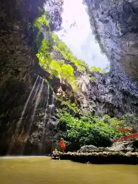 The Celestial Cave, located in Jiulong Town, Yingde, is renowned as the "Number One Pit in South China." It is a popular tourist destination in Qingyuan. Formed by karst topography, the site features a massive skylight-like sinkhole above, a deep pit cave within, and a river flowing below.