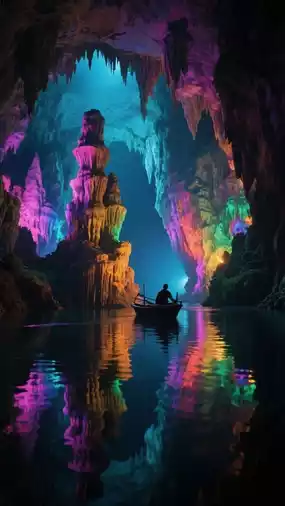 Boat ride into the underground dark river, stalactites in all shapes, dreamy lighting