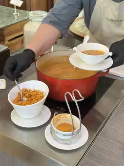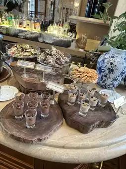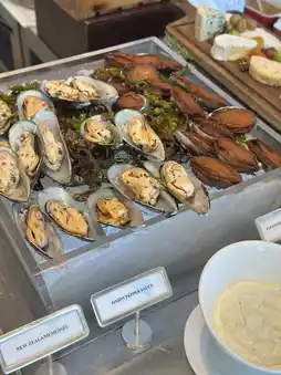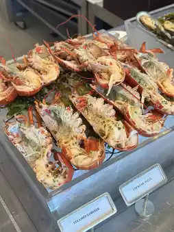 The seafood cold plate selection is very rich, with lobster, bacon, mussels, and scallops, all very fresh. The standard of the sashimi area is also good. The appetizers were full of surprises, with lobster crab meat and salmon roe buns with my favorite fillings; Hamachi ceviche and Scallop crudo with fresh ingredients. The most eye-catching is the fried goose liver with red wine sauce, cooked on site by the master, fragrant; and my favorite super rich lobster soup 🤩🤩.