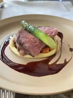 **Roasted American Beef Fillet with Aged Port Wine Sauce**: The beef fillet is pink and juicy, perfectly blended with oil and wine, and a bottom layer with French mixed vegetables and smooth mashed potatoes.