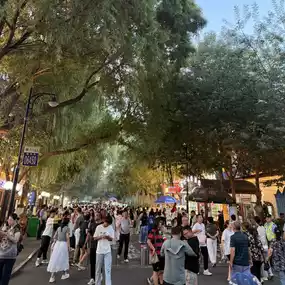 We walked, ate, and took photos to capture the atmosphere. Notice the abundance of trees along the road, creating a pleasant shade.