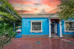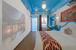 The homestay features an eye-catching blue-and-white color scheme that perfectly complements the clear autumn sky 💙. Every casual photo you take here looks like an unfiltered exotic masterpiece 📸! While the lush green grapevines of summer have faded, the golden vines now wrap around the wooden trellis, with sunlight filtering through to create dappled patterns 🌞. Sitting at the table under the trellis, surrounded by the gentle autumn breeze, sipping a cup of hot tea and daydreaming, time seems to slow down.