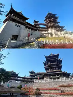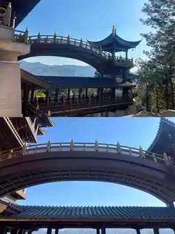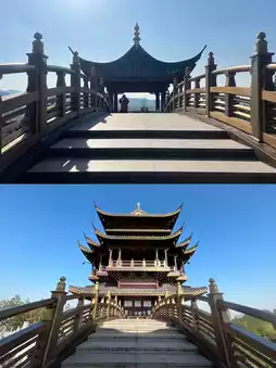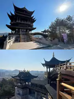 Yiwu's new landmark, opened in 2021, is designed with a combination of buildings, bridges, pavilions, and platforms. It is divided into parts according to the mountain situation, with layered platforms and pavilions winding up. The main building symbolizing the 'Phoenix Head' becomes the highest point. The chicken-shaped treasure top and tile echo the term 'Jiming', and the phoenix pattern carved in the wooden part shows the exquisite art of Dongyang wood carving.