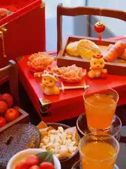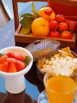 The afternoon tea also includes a fresh fruit plate composed of hawthorn and orange, a pistachio, and two cups of "Lucky Orange Tea"🍊🍊🍊