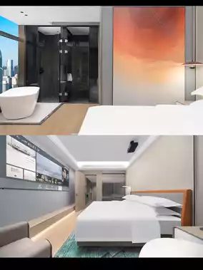 The bathroom has separate wet and dry areas, and is fully equipped with high-quality toiletries. What's particularly impressive is the in-room smart technology. The lights and curtains can be controlled by voice commands, adding a touch of futuristic flair and instantly enhancing the check-in experience.